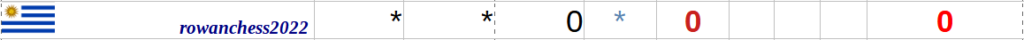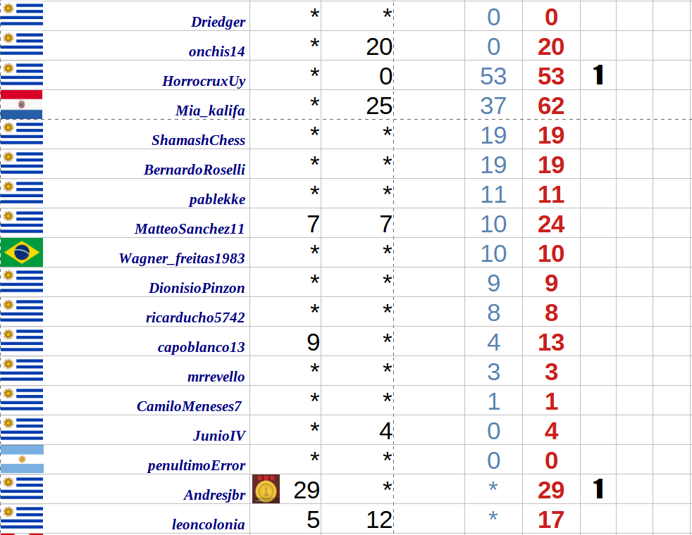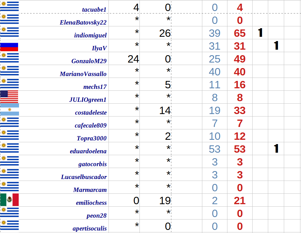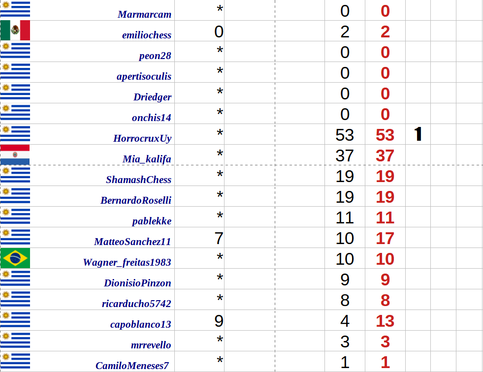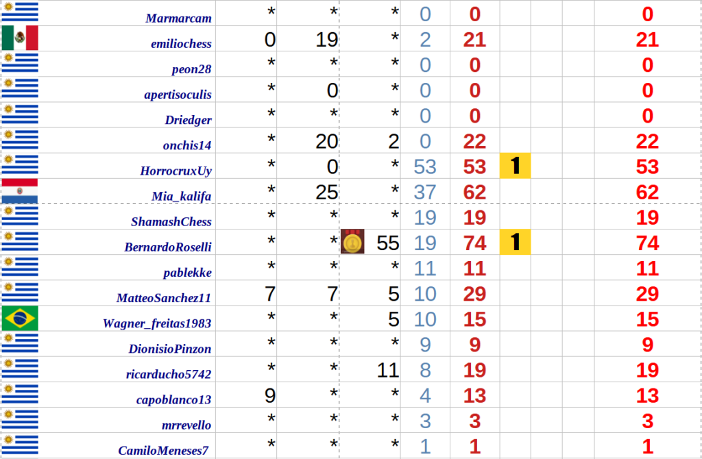 A todo esto manifestar el AGRADECIMIENTO TOTAL a la ENORME ACOGIDA que exisitio el día de hoy en cada una de las 3 diferentes ETAPAS y recalcar que OTRA vez el Master INTERNACIONAL y MULTIPLE Campeón Uruguayo Bernardo Roselli se hizo presente, en esta ocacion jugando el evento casi en su totalidad, exactamente 16 partidas de las cuales GANO 15 – ENTABLO 1 – y NO fue derrotado y aún asi, con estos numeros solo sumo 1pts de ELO !!!
