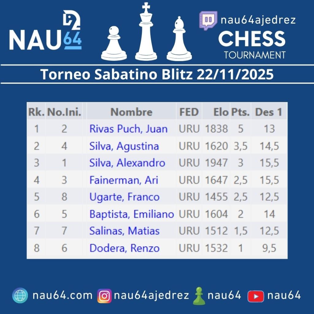 El torneo, disputado el 22 de noviembre en Montevideo bajo el sistema suizo a 5 rondas y ritmo de 10+5, reunió a jugadores de todas las edades en un ambiente competitivo y cálido.