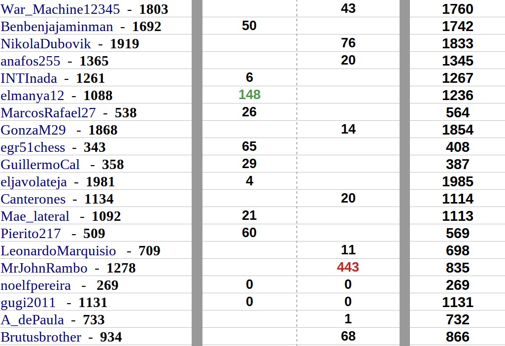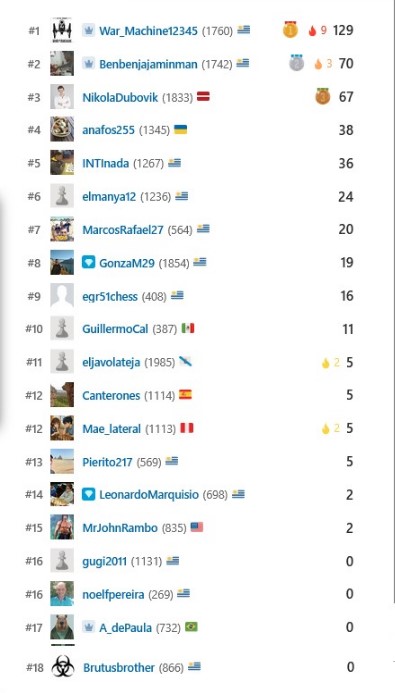 Un total de 20 participantes se dieron cita en busca de lograr «chorear» ELO ademas de pelear por ser el mejor en dicho torneo,… lo intentaron y dejaron todo durante 2 hrs (hasta hubieron ratones de PC rotos de por medio), fue una muy divertida contienda de la cuál se termina quedando con el titulardo de «Campeón» el amigo «War_Machine» con un total de 129 puntos y sumando 36 Victorias y 6 Derrotas sin empates y aunque usted no lo crea le chorearon 43pts de ELO!