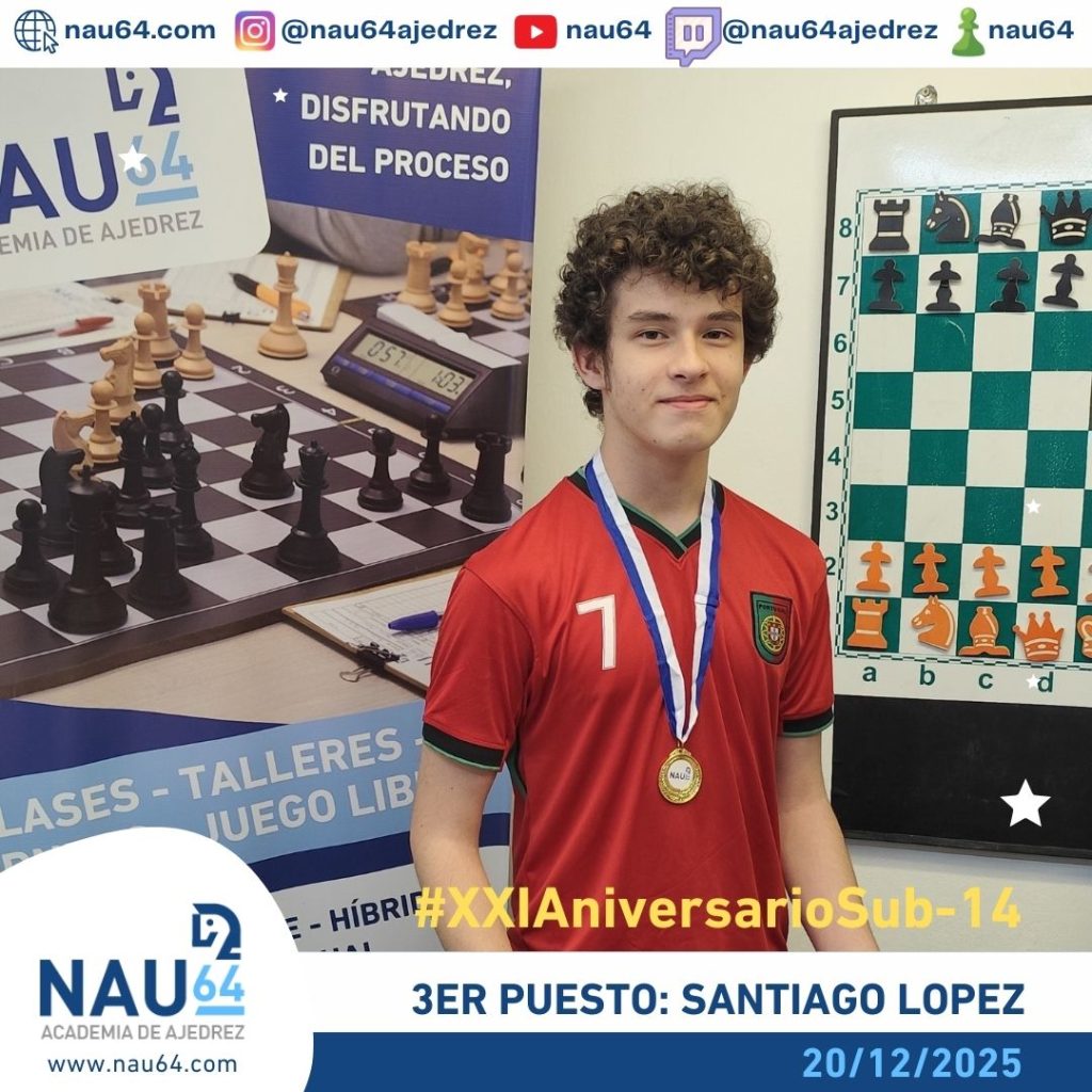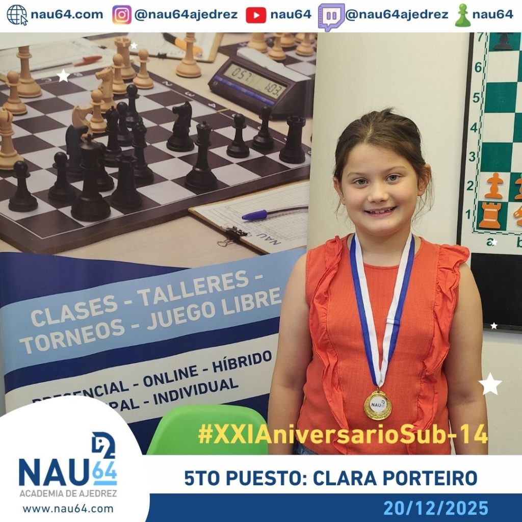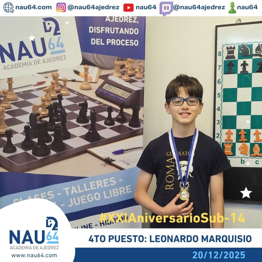 En la Academia Nau64, los días 20 y 21 de diciembre se desarrolló el XXI Aniversario de nuestra academia. Este evento constó de tres torneos. El primero de ellos fue el Torneo Aniversario Sub-14, el cual se disputó el día 20 de diciembre, Se desarrolló bajo el formato sistema suizo de 5 rondas, con un ritmo de 10 minutos más 5 segundos de incremento por jugada, La primera ronda comenzó a las 10:00 hs.