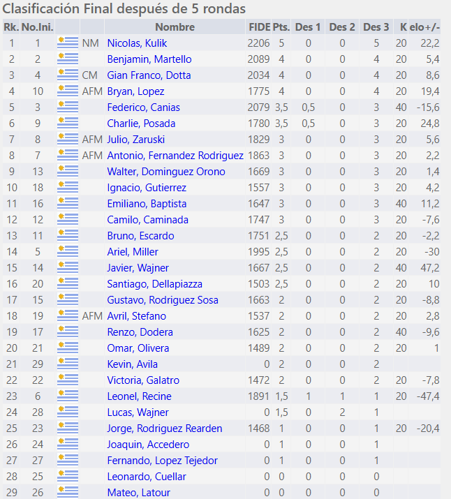 Con un impecable 5 en 5, el joven campeón uruguayo Sub-18 Nicolás Kulik se consagró en el tradicional sabatino de la Academia. En esta ocasión lo acompañaron en el podio la AFM Avril Stefano, destacada como mejor jugadora femenina, y el joven Kevin Ávila, quien repitió como mejor no rankeado.